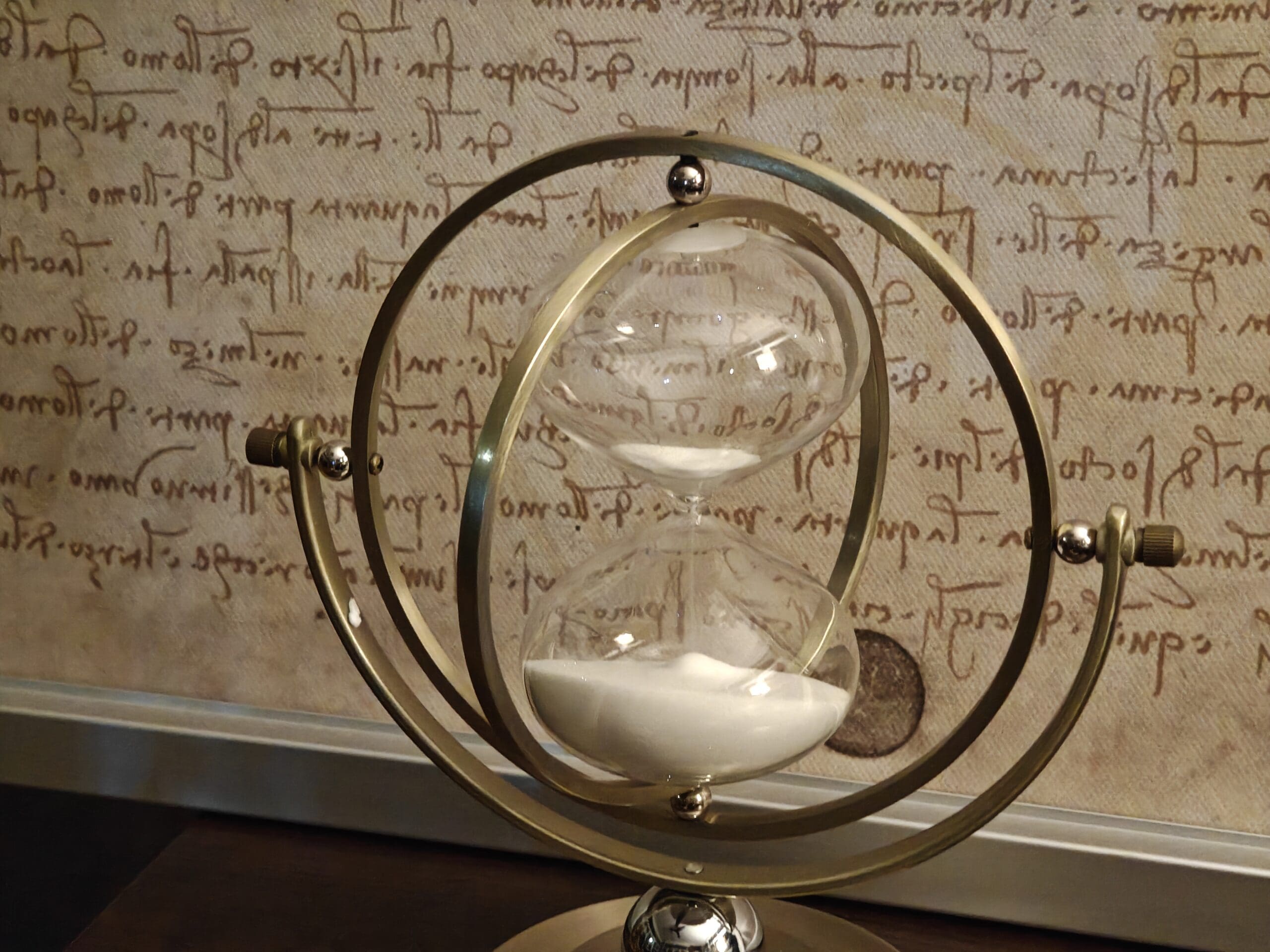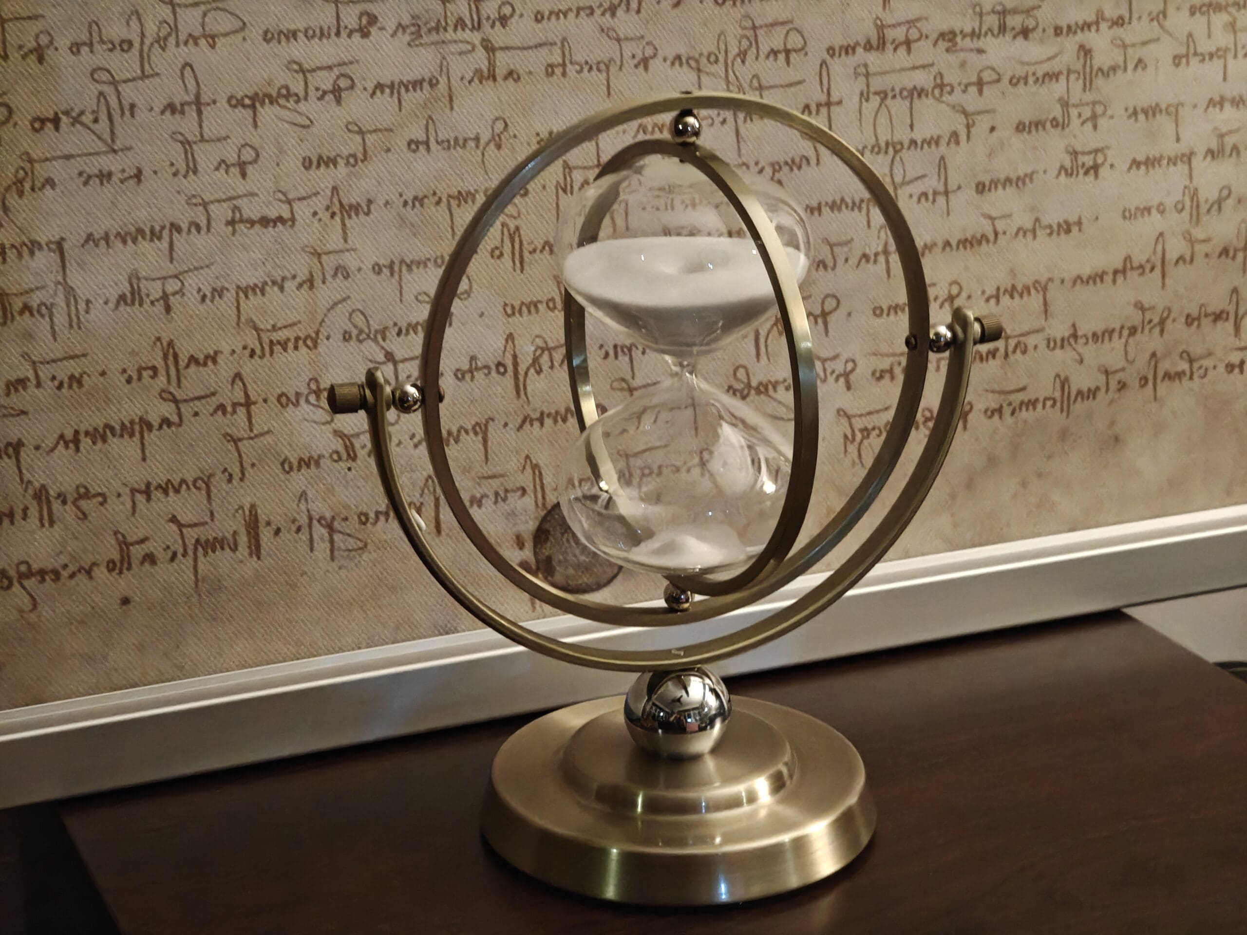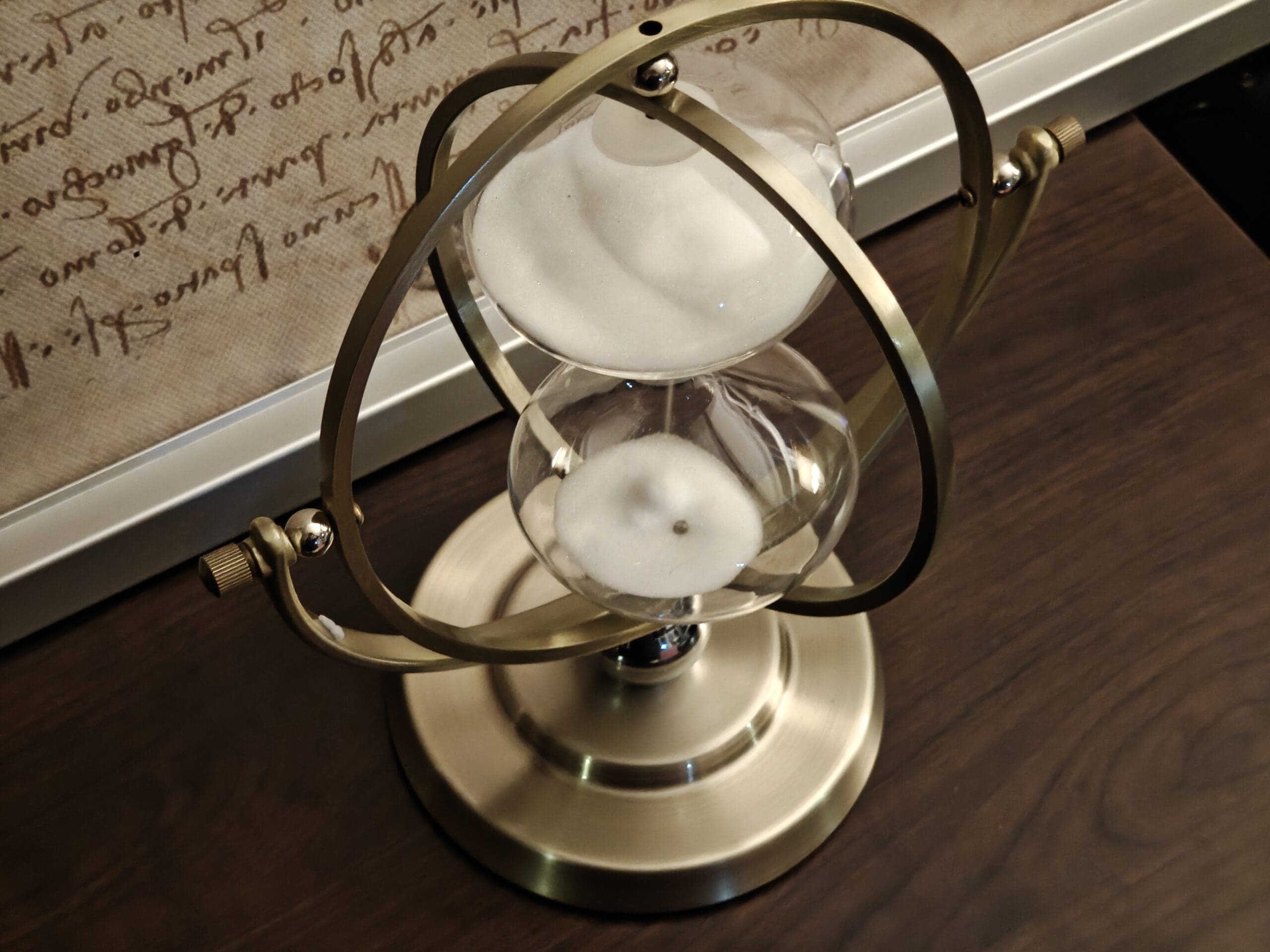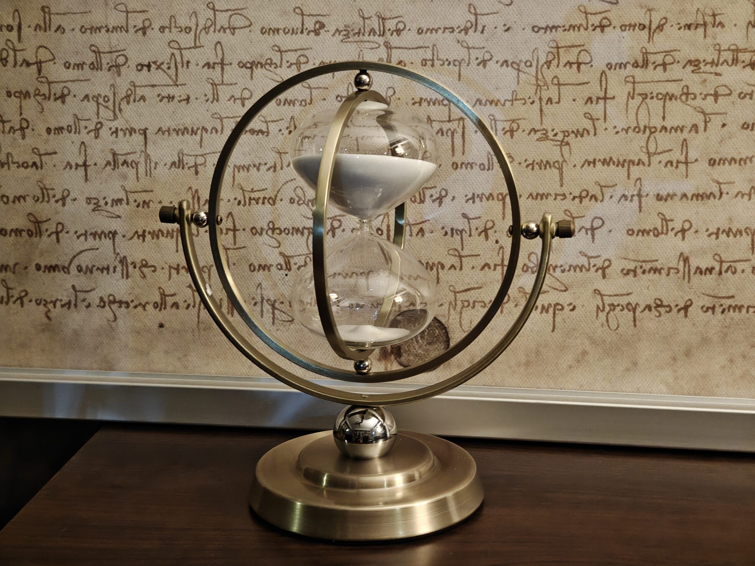 We turned to the ancient armillary sphere—a symbol of motion, recursion, and cosmic alignment—and reimagined it as a hand-held tool for personal orientation. Each component is made from solid brass, hand-assembled to create a kinetic structure that rotates on multiple axes. The hourglass at its core is calibrated to mark exactly 30 minutes, using fine-grain white sand for smooth, consistent flow.