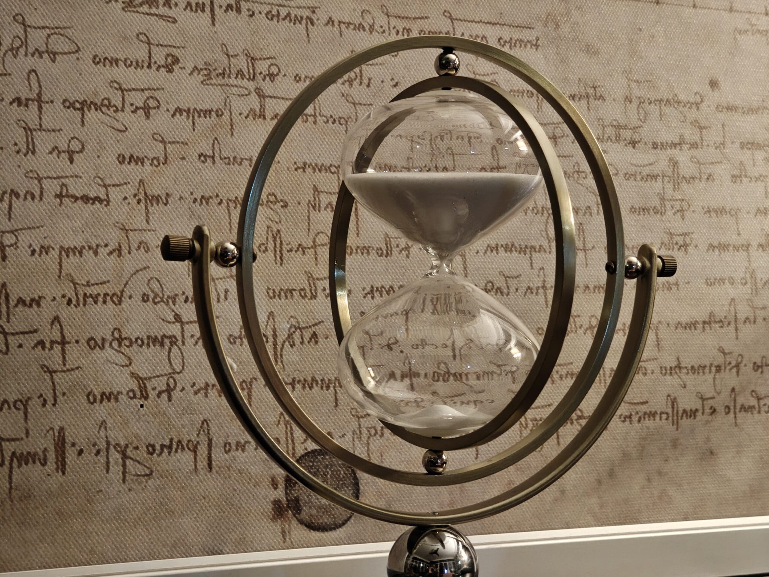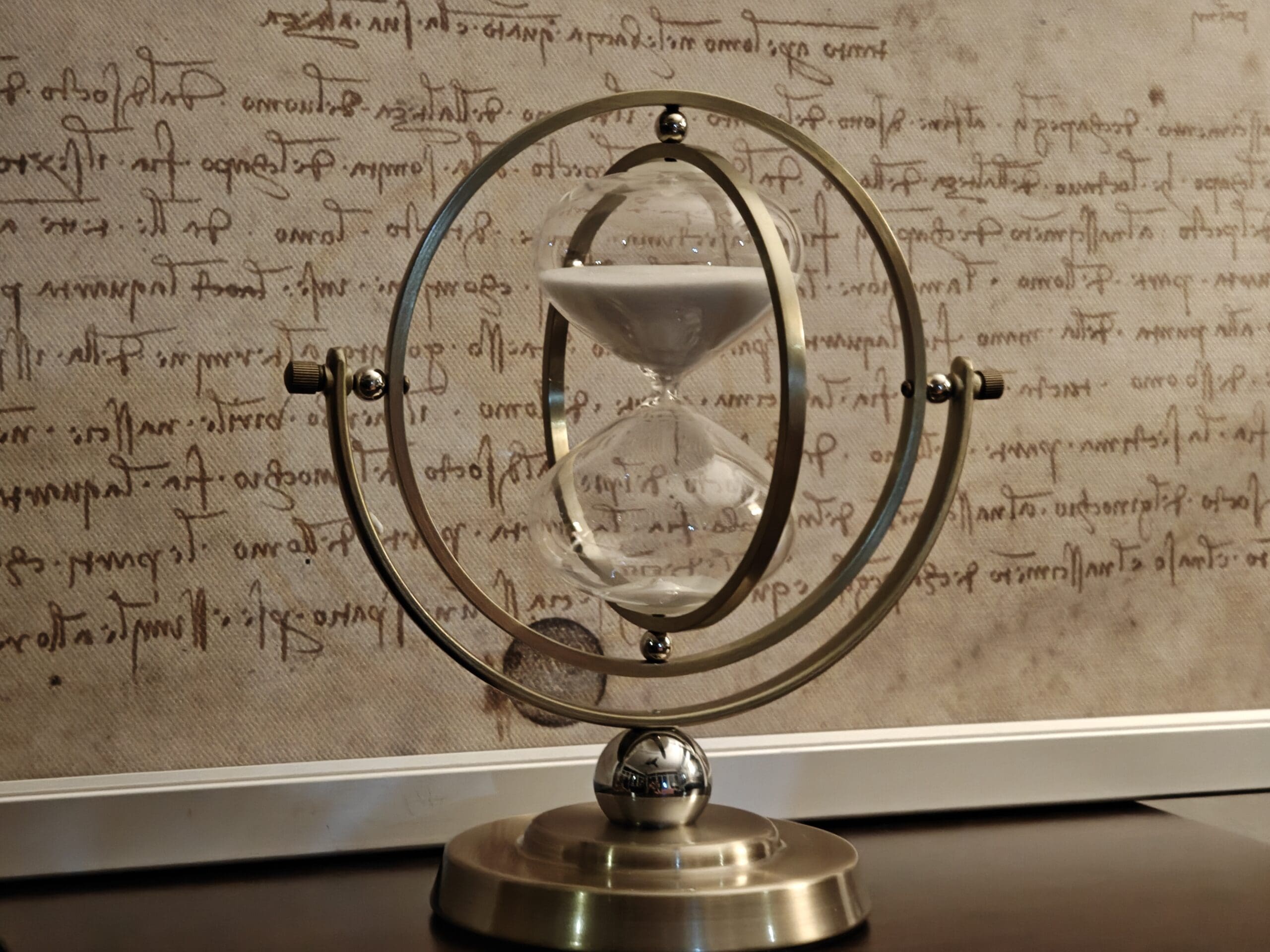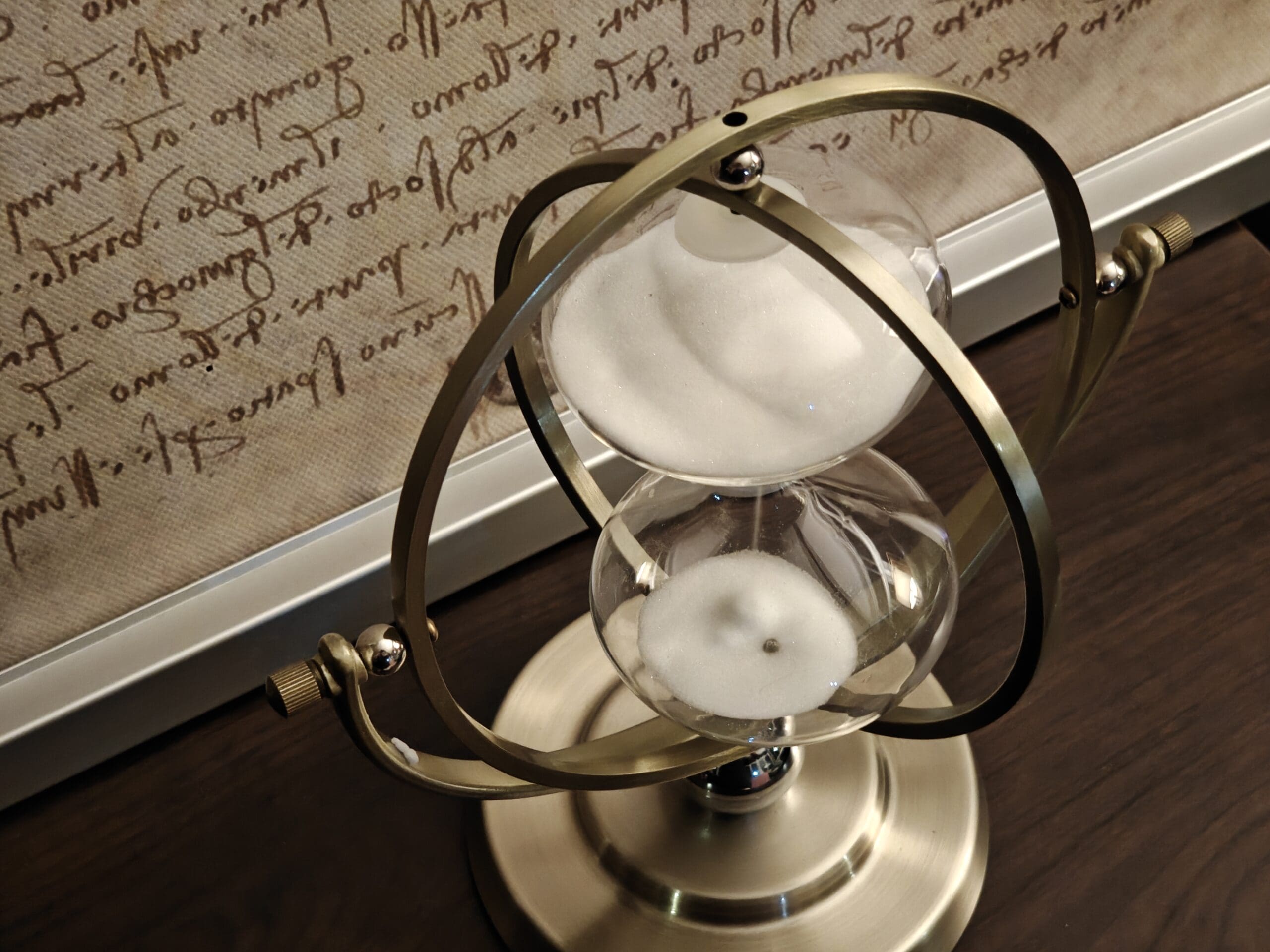 We turned to the ancient armillary sphere—a symbol of motion, recursion, and cosmic alignment—and reimagined it as a hand-held tool for personal orientation. Each component is made from solid brass, hand-assembled to create a kinetic structure that rotates on multiple axes. The hourglass at its core is calibrated to mark exactly 30 minutes, using fine-grain white sand for smooth, consistent flow.