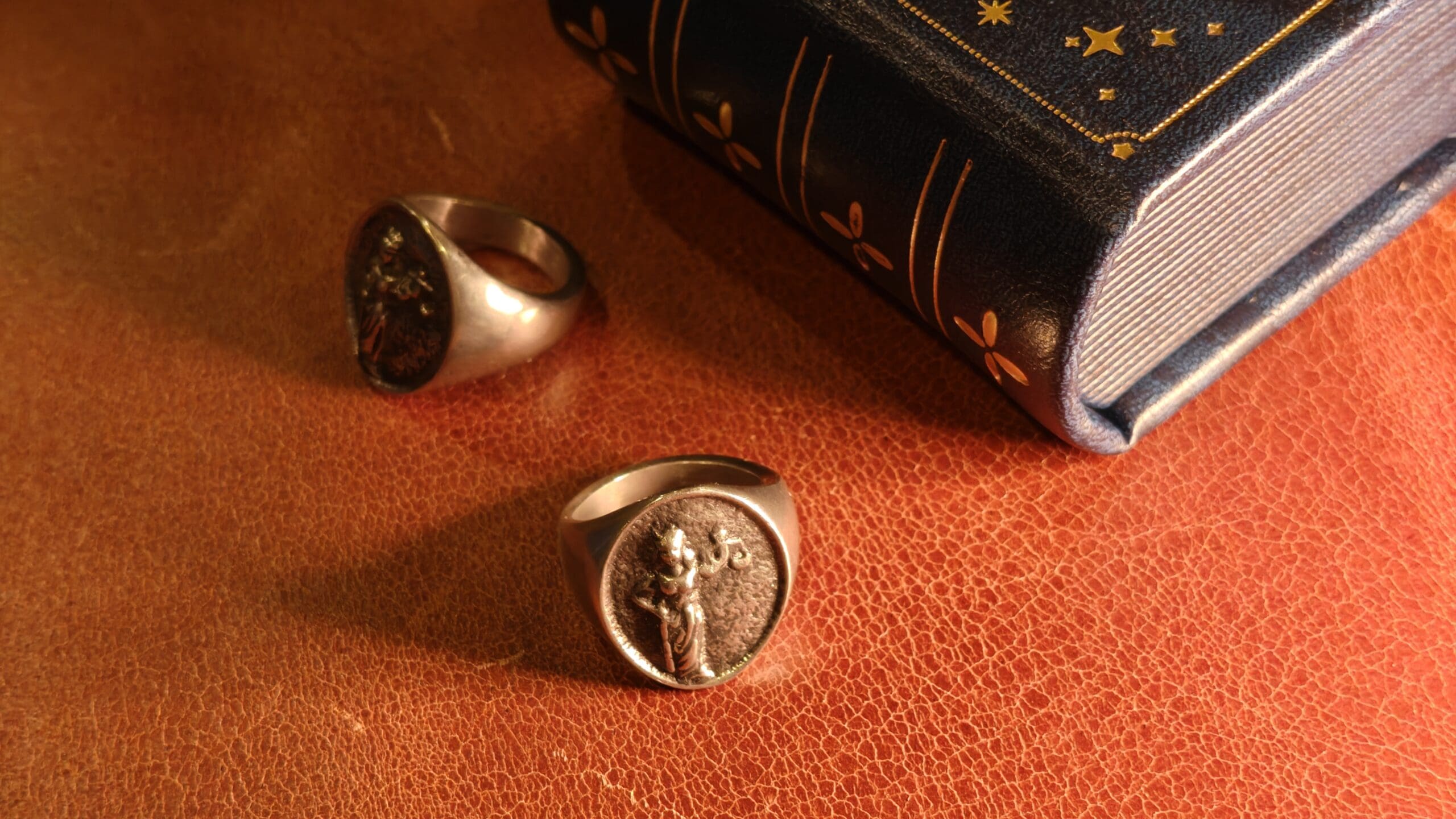 Each ring is shaped in high-grade pewter by an independent ringsmith and artist, chosen for its ability to hold detail with clarity and for the quiet patina it develops over time.