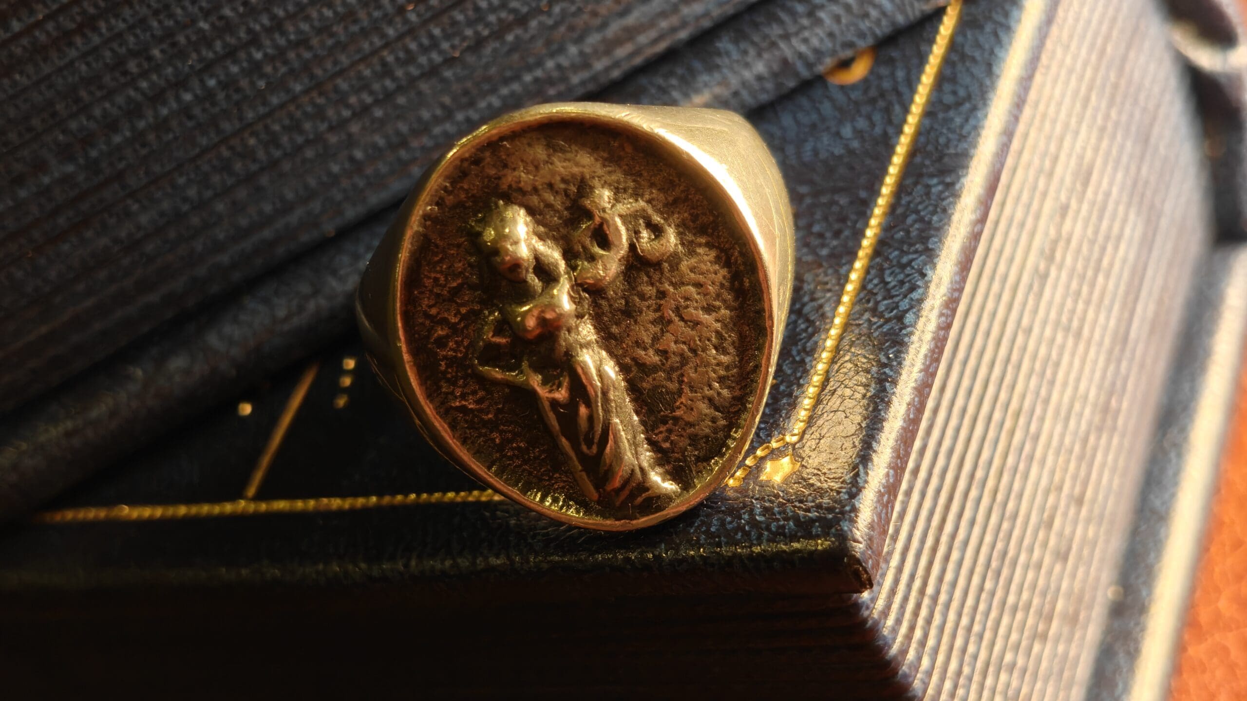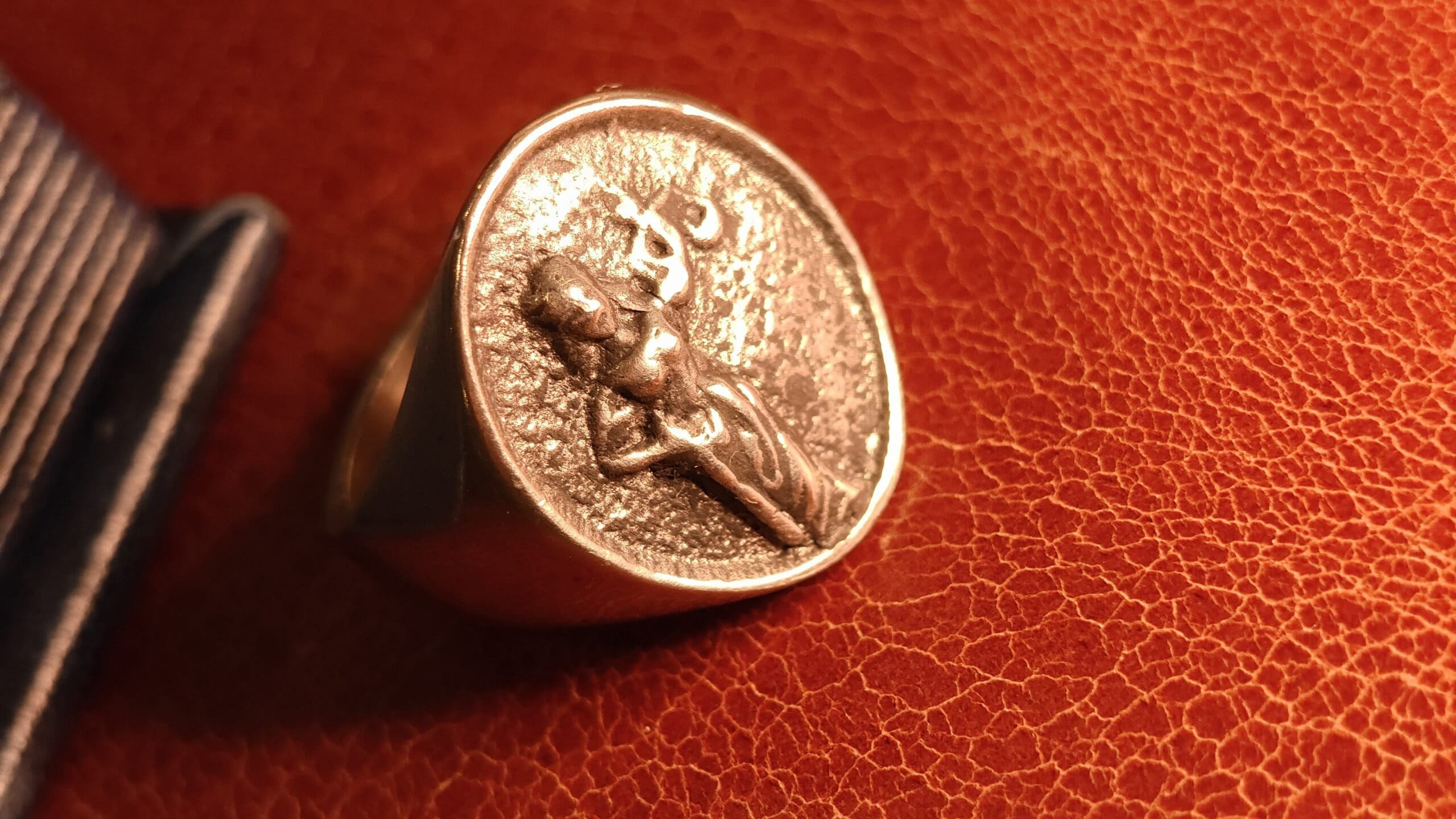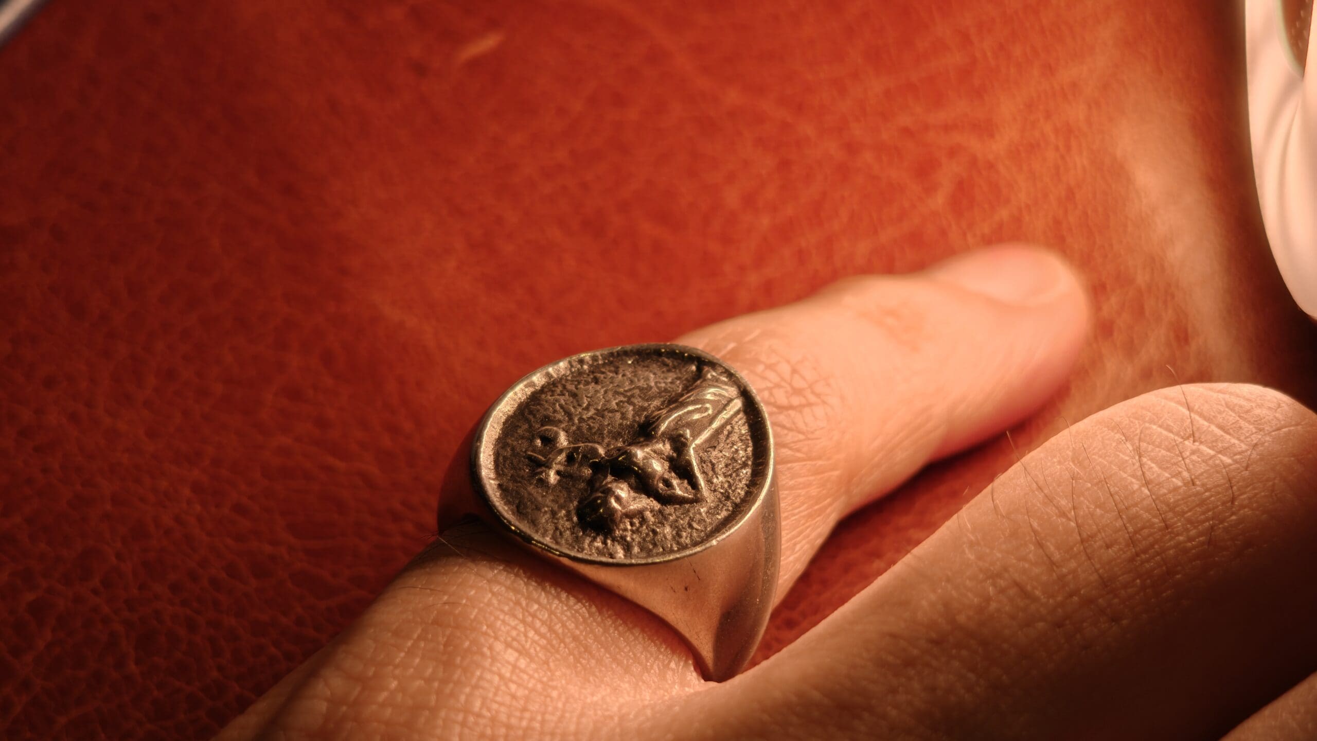 The proportions were refined to give the ring presence without excess: the engraved scales set against a textured face, the band polished smooth to rest naturally against the skin. The weight was selected not for luxury, but for reminder—a steady counterpoint to the impermanence of thought.